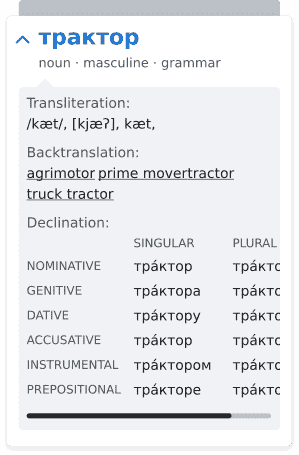 Some languages have complicated grammar. In Glosbe you can check the conjugation and declension tables. Just click the word.